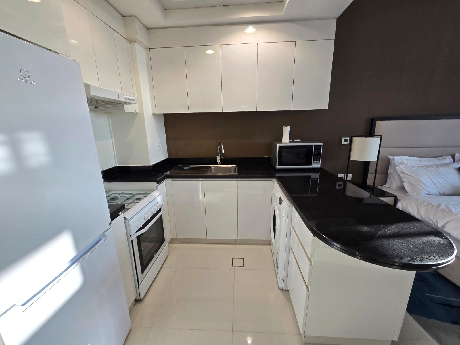 – Fully equipped kitchen with modern appliances: fridge, stove, microwave, and more